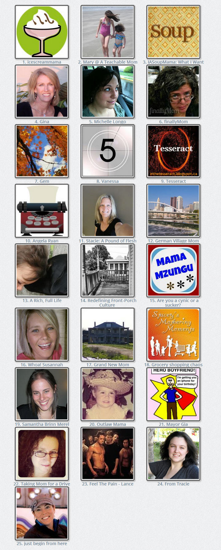 Type in the name of each blog on the grid if it’s not filled in by the time you download your copy. Don’t go by the number assigned on the grid. Once the grid closes to submissions, the thumbnails will sort themselves by number of page views and all the original numbers will change.
